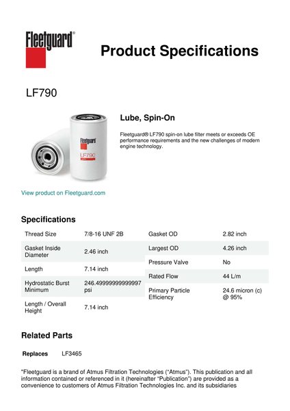Fleetguard® LF790 spin-on lube filter meets or exceeds OE performance requirements and the new challenges of modern engine technology.Specification