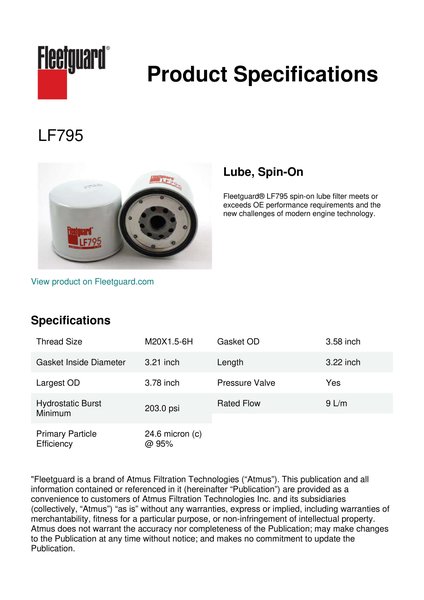 Fleetguard® LF795 spin-on lube filter meets or exceeds OE performance requirements and the new challenges of modern engine technology.Specification