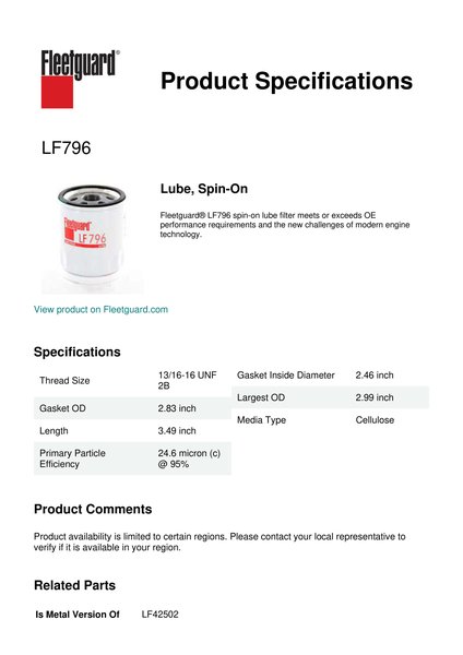 Fleetguard® LF796 spin-on lube filter meets or exceeds OE performance requirements and the new challenges of modern engine technology.Specification
