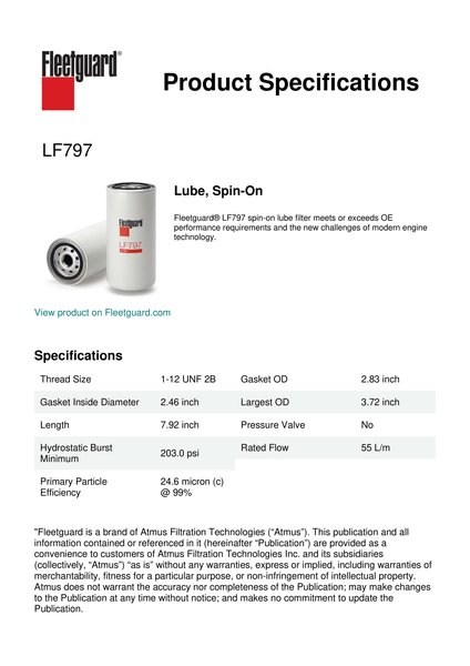 Fleetguard® LF797 spin-on lube filter meets or exceeds OE performance requirements and the new challenges of modern engine technology.Specification
