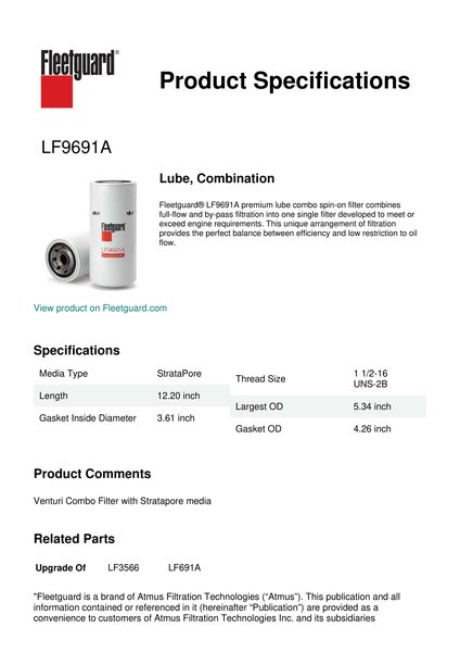 Fleetguard® LF9691A premium lube combo spin-on filter combines full-flow and by-pass filtration into one single filter developed to meet or exceed engine requirements. This unique arrangement of filtration provides the perfect balance between efficiency and low restriction to oil flow.Specification