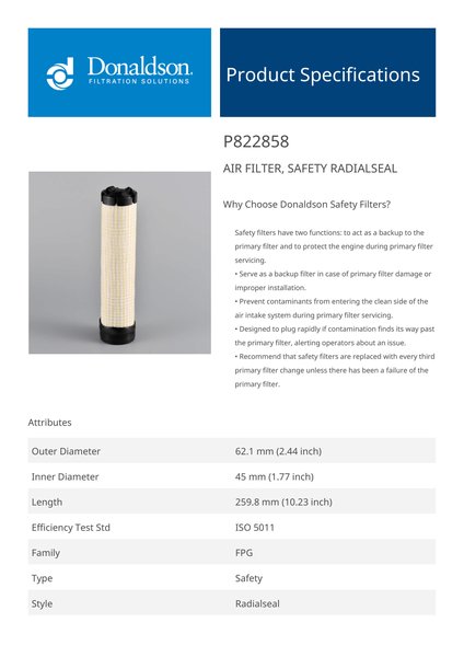 Why Choose Donaldson Safety Filters?Safety filters have two functions: to act as a backup to the primary filter and to protect the engine during primary filter servicing.