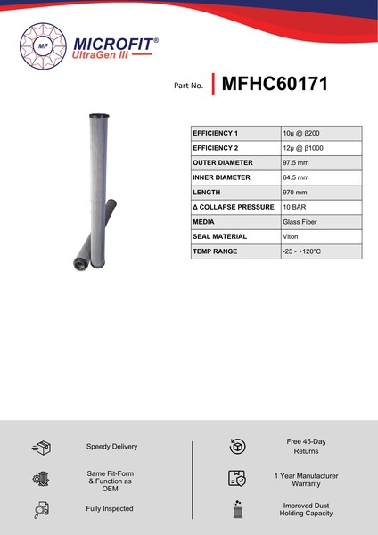 Genuine MICROFIT® UltraGen III MFHC60171 Coreless Filter. Engineered and manufactured in Great Britain the MFHC60171 is designed to meet or exceed the quality and performance of OEM quality standards, ensuring superior filtration performance and the longest possible filter life.Building on over 50 years of filtration expertise, the UltraGen III series is the third generation of MICROFIT® filter media, delivering exceptional efficiency and reliability.