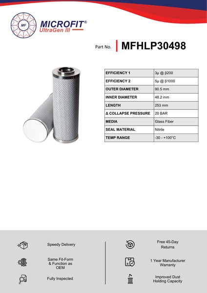 Genuine MICROFIT® UltraGen III MFHLP30498 Pressure Filter. Engineered and manufactured in Great Britain the MFHLP30498 is designed to meet or exceed the quality and performance of OEM quality standards, ensuring superior filtration performance and the longest possible filter life.Building on over 50 years of filtration expertise, the UltraGen III series is the third generation of MICROFIT® filter media, delivering exceptional efficiency and reliability.