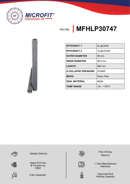 Genuine MICROFIT® UltraGen III MFHLP30747 Pressure Filter. Engineered and manufactured in Great Britain the MFHLP30747 is designed to meet or exceed the quality and performance of OEM quality standards, ensuring superior filtration performance and the longest possible filter life.Building on over 50 years of filtration expertise, the UltraGen III series is the third generation of MICROFIT® filter media, delivering exceptional efficiency and reliability.