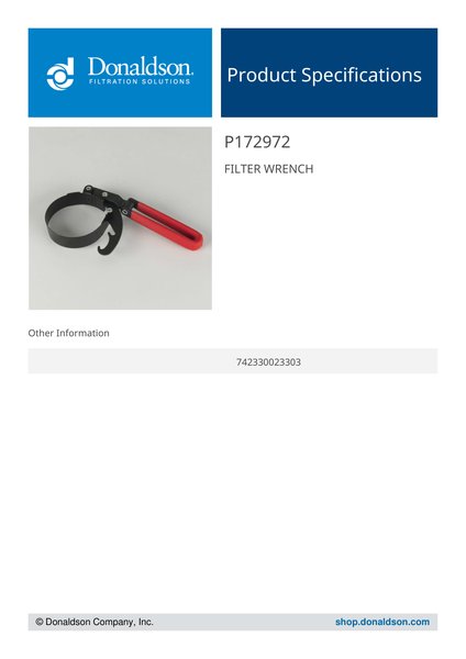 Genuine Donaldson P172972 Filter Wrench is engineered to deliver reliable performance and durability across a wide range of applications. Designed with high-quality materials, it ensures consistent functionality while meeting demanding operational requirements.