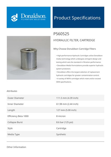 Genuine Donaldson P560525 Hydraulic Cartridge offers superior filtration performance, effectively removing contaminants from hydraulic fluids. Its high-capacity design helps maintain fluid cleanliness and system efficiency.