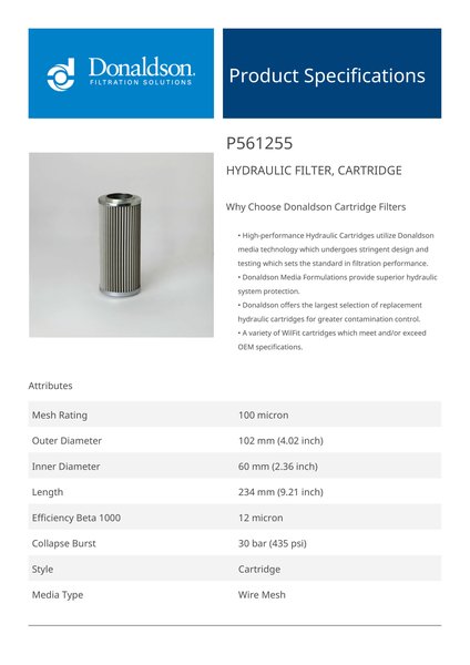 Genuine Donaldson P561255 Hydraulic Cartridge offers superior filtration performance, effectively removing contaminants from hydraulic fluids. Its high-capacity design helps maintain fluid cleanliness and system efficiency.