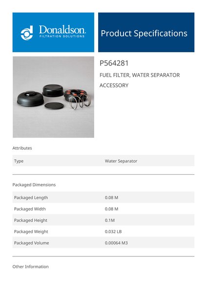 Genuine Donaldson P564281 Fuel/Water Separator Accy is engineered to deliver reliable performance and durability across a wide range of applications. Designed with high-quality materials, it ensures consistent functionality while meeting demanding operational requirements.