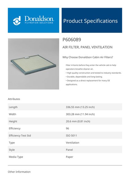 Genuine Donaldson P606089 Air Panel, Ventilation is designed to provide reliable performance in air panel, ventilation applications. Built with high-quality materials, it ensures consistent functionality and durability.