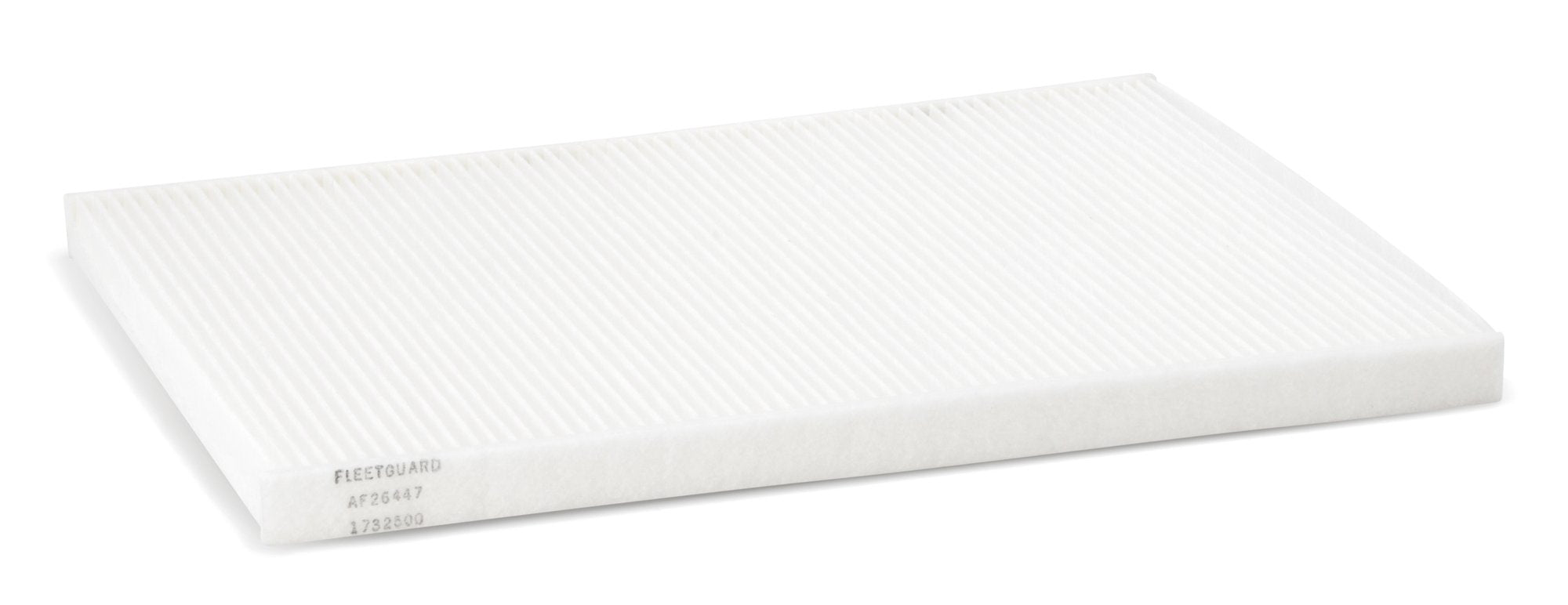 Fleetguard® AF26447 panel cabin air filter provides clean air in the cab which means a clean work environment. Breathing cleaner air can lead to longer and more productive working hours.Specification