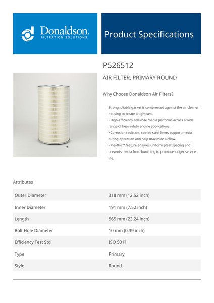 Donaldson P526512 Air Filter, Primary Round | Replaces the Baldwin PA3464