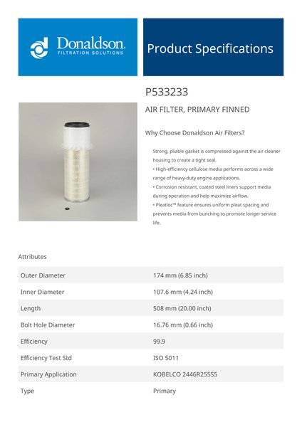 Donaldson P533233 Air Filter, Primary Finned | Replaces the Baldwin PA3630FN