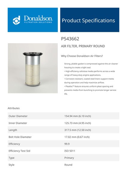 Donaldson P543662 Air Filter, Primary Round | Replaces the Baldwin PA3636