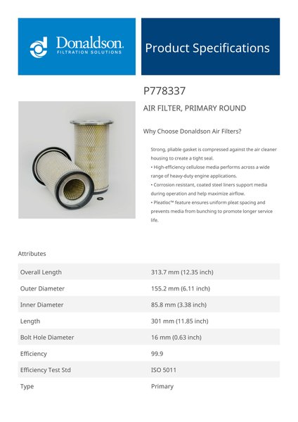 Donaldson P778337 Air Filter, Primary Round | Replaces the Baldwin PA3670