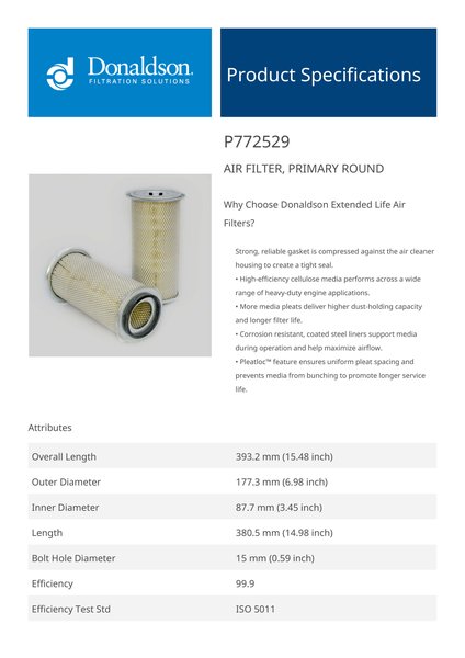 Donaldson P772529 Air Filter, Primary Round | Replaces the Baldwin PA3690