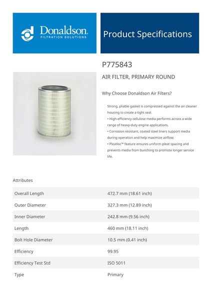 Genuine Donaldson P775843 Air Filter, Primary Round is crafted to provide outstanding engine protection by filtering out dust, dirt, and debris before they reach the combustion chamber. Its round design maximizes airflow while maintaining exceptional filtration efficiency, supporting better fuel economy and engine performance.