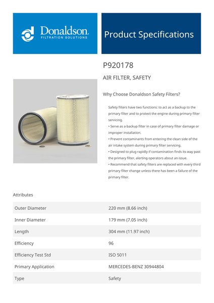 Genuine Donaldson P920178 Air Filter, Safety acts as a crucial secondary layer of defense in your air filtration system, capturing fine dust particles that bypass the primary filter. This extra layer of protection helps prevent engine wear and supports consistent performance, especially in dusty or harsh environments.
