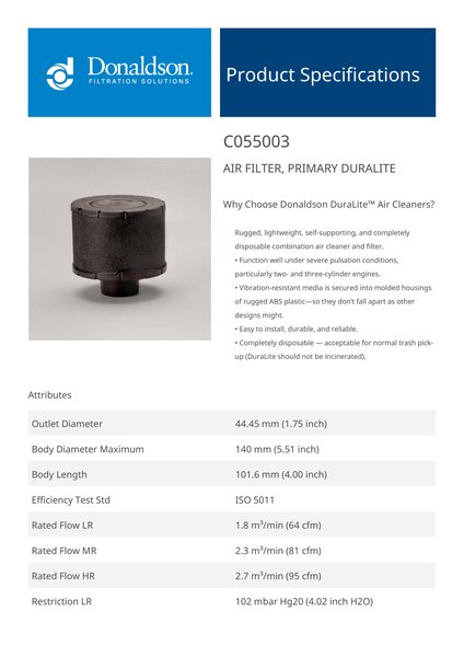 Why Choose Donaldson DuraLite™ Air Cleaners?Rugged, lightweight, self-supporting, and completely disposable combination air cleaner and filter.
