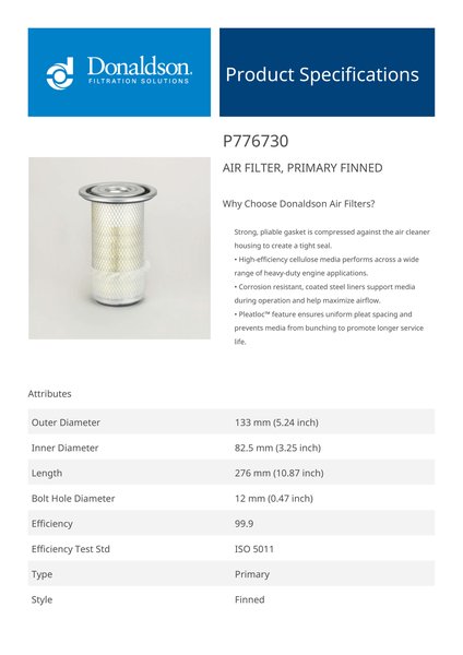 Donaldson P776730 Air Filter, Primary Finned | Replaces the Baldwin PA4674FN