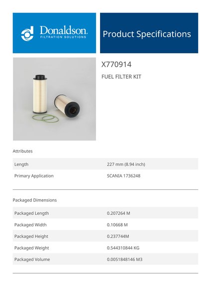 Genuine Donaldson X770914 Fuel Filter Kit is designed to provide reliable performance in fuel filter kit applications. Built with high-quality materials, it ensures consistent functionality and durability.