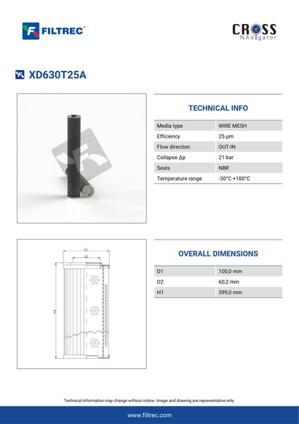 Genuine Filtrec XD630T25A. This Filtrec element is designed to meet or exceed the quality and performance of brand OEM’s ensuring superior filtration performance and long-lasting durability.