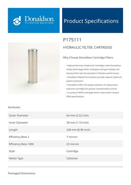 Genuine Donaldson P175111 Hydraulic Filter, Cartridge is designed to provide superior protection for your hydraulic system, effectively capturing contaminants to ensure clean fluid circulation. With high-quality filtration media, it extends equipment life, improves operational efficiency, and maintains fluid cleanliness even in the most demanding environments.