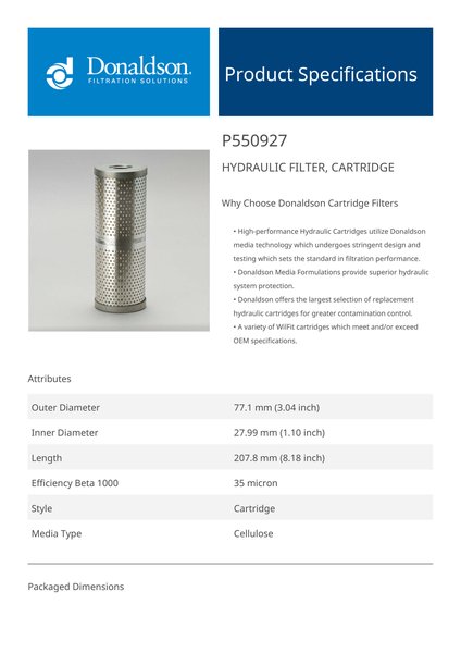 Genuine Donaldson P550927 Hydraulic Filter, Cartridge is designed to provide superior protection for your hydraulic system, effectively capturing contaminants to ensure clean fluid circulation. With high-quality filtration media, it extends equipment life, improves operational efficiency, and maintains fluid cleanliness even in the most demanding environments.