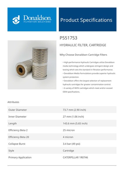 Genuine Donaldson P551753 Hydraulic Filter, Cartridge is designed to provide superior protection for your hydraulic system, effectively capturing contaminants to ensure clean fluid circulation. With high-quality filtration media, it extends equipment life, improves operational efficiency, and maintains fluid cleanliness even in the most demanding environments.