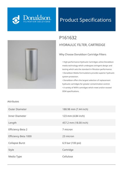 Genuine Donaldson P161632 Hydraulic Filter, Cartridge is designed to provide superior protection for your hydraulic system, effectively capturing contaminants to ensure clean fluid circulation. With high-quality filtration media, it extends equipment life, improves operational efficiency, and maintains fluid cleanliness even in the most demanding environments.