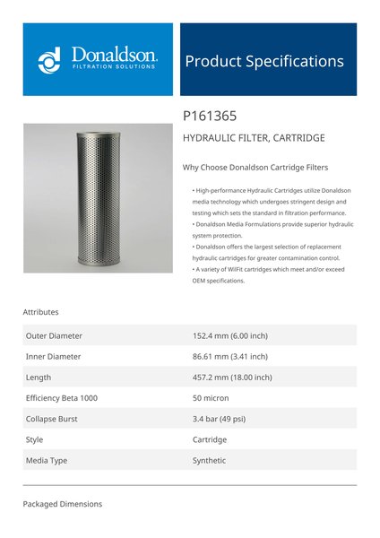 Genuine Donaldson P161365 Hydraulic Filter, Cartridge is designed to provide superior protection for your hydraulic system, effectively capturing contaminants to ensure clean fluid circulation. With high-quality filtration media, it extends equipment life, improves operational efficiency, and maintains fluid cleanliness even in the most demanding environments.
