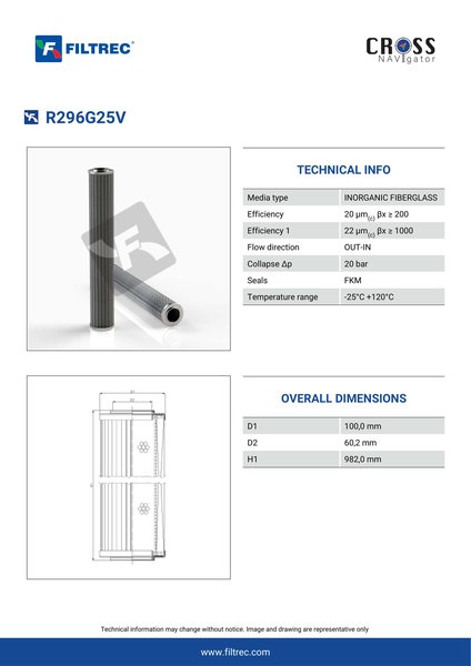 Genuine Filtrec R296G25V. This Filtrec element is designed to meet or exceed the quality and performance of brand OEM’s ensuring superior filtration performance and long-lasting durability.