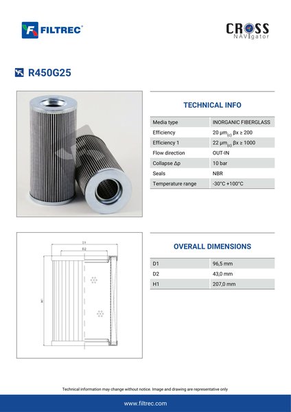 Genuine Filtrec R450G25. This Filtrec element is designed to meet or exceed the quality and performance of brand OEM’s ensuring superior filtration performance and long-lasting durability.Engineered with their high performance media and a durable design, the R450G25 provides reliable and consistent performance over its lifespan, even in harsh operating environments. When you order from FilterFinder, you can trust that you are getting a reliable and high-quality replacement filter that will keep your system running smoothly.