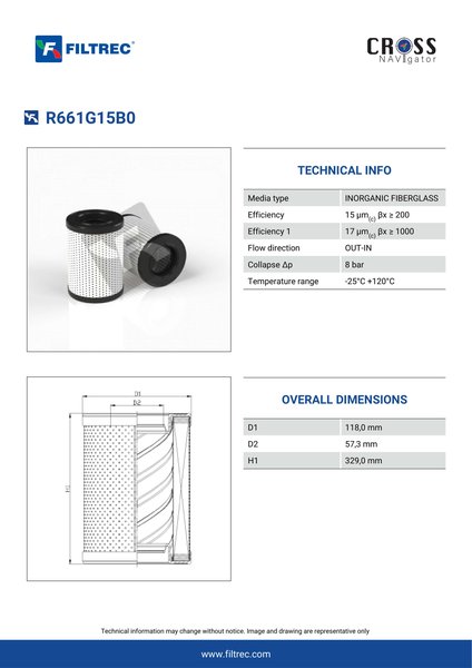 Engineered with their high performance media and a durable design, the R661G15B0 provides reliable and consistent performance over its lifespan, even in harsh operating environments. When you order from FilterFinder, you can trust that you are getting a reliable and high-quality replacement filter that will keep your system running smoothly.