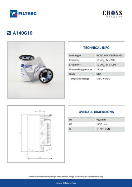Genuine Filtrec A140G10. This Filtrec element is designed to meet or exceed the quality and performance of brand OEM’s ensuring superior filtration performance and long-lasting durability.Engineered with their high performance media and a durable design, the A140G10 provides reliable and consistent performance over its lifespan, even in harsh operating environments. When you order from FilterFinder, you can trust that you are getting a reliable and high-quality replacement filter that will keep your system running smoothly.