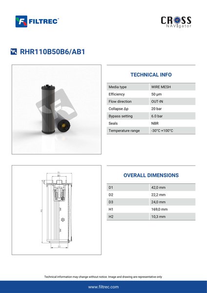Genuine Filtrec RHR110B50B6/AB1. This Filtrec element is designed to meet or exceed the quality and performance of brand OEM’s ensuring superior filtration performance and long-lasting durability.Engineered with their high performance media and a durable design, the RHR110B50B6/AB1 provides reliable and consistent performance over its lifespan, even in harsh operating environments. When you order from FilterFinder, you can trust that you are getting a reliable and high-quality replacement filter that will keep your system running smoothly.