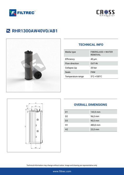 Engineered with their high performance media and a durable design, the RHR1300AW40V0/AB1 provides reliable and consistent performance over its lifespan, even in harsh operating environments. When you order from FilterFinder, you can trust that you are getting a reliable and high-quality replacement filter that will keep your system running smoothly.