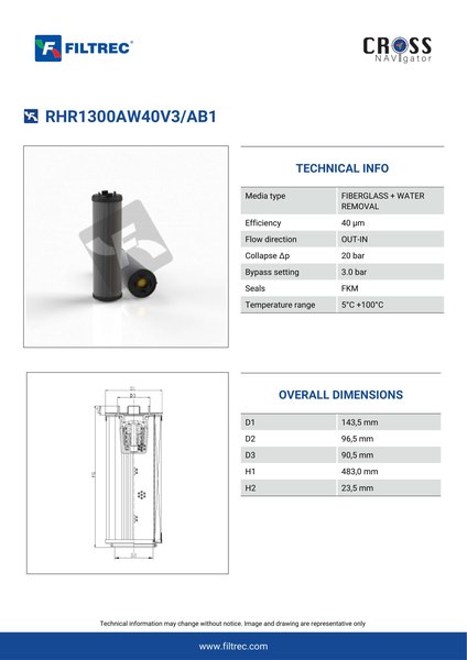 Genuine Filtrec RHR1300AW40V3/AB1. This Filtrec element is designed to meet or exceed the quality and performance of brand OEM’s ensuring superior filtration performance and long-lasting durability.Engineered with their high performance media and a durable design, the RHR1300AW40V3/AB1 provides reliable and consistent performance over its lifespan, even in harsh operating environments. When you order from FilterFinder, you can trust that you are getting a reliable and high-quality replacement filter that will keep your system running smoothly.