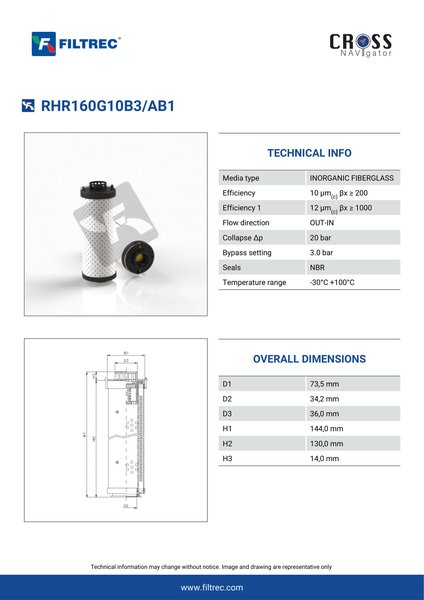 Genuine Filtrec RHR160G10B3/AB1. This Filtrec element is designed to meet or exceed the quality and performance of brand OEM’s ensuring superior filtration performance and long-lasting durability.Engineered with their high performance media and a durable design, the RHR160G10B3/AB1 provides reliable and consistent performance over its lifespan, even in harsh operating environments. When you order from FilterFinder, you can trust that you are getting a reliable and high-quality replacement filter that will keep your system running smoothly.
