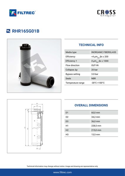 The efficiency of the element is shown using the Micron (µ) and Beta (β) ratings. The micron rating indicates the size of the particle being filtered and the beta rating the efficiency, calculated as 1/β.