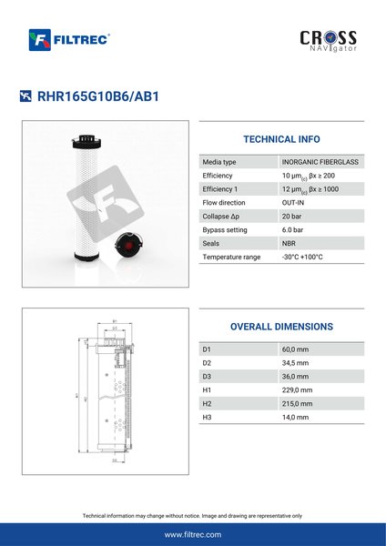 Genuine Filtrec RHR165G10B6/AB1. This Filtrec element is designed to meet or exceed the quality and performance of brand OEM’s ensuring superior filtration performance and long-lasting durability.Engineered with their high performance media and a durable design, the RHR165G10B6/AB1 provides reliable and consistent performance over its lifespan, even in harsh operating environments. When you order from FilterFinder, you can trust that you are getting a reliable and high-quality replacement filter that will keep your system running smoothly.