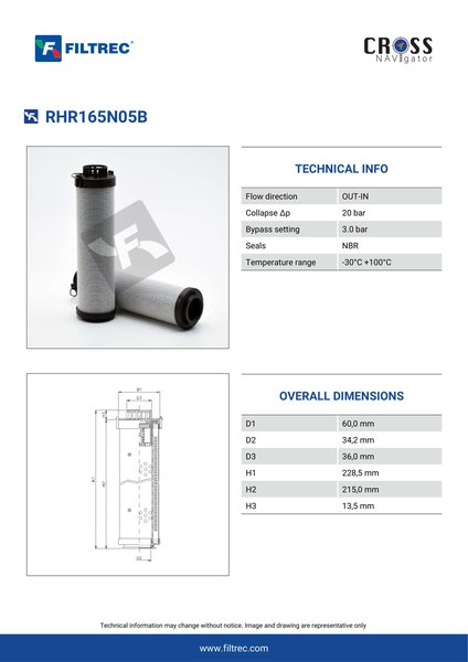 Engineered with their high performance media and a durable design, the RHR165N05B provides reliable and consistent performance over its lifespan, even in harsh operating environments. When you order from FilterFinder, you can trust that you are getting a reliable and high-quality replacement filter that will keep your system running smoothly.