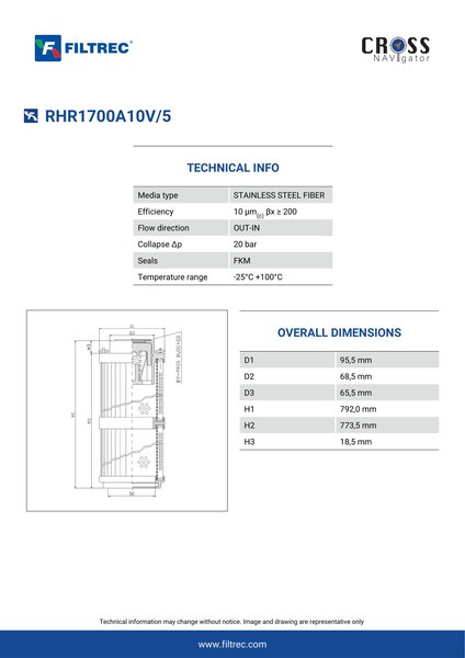 The efficiency of the element is shown using the Micron (µ) and Beta (β) ratings. The micron rating indicates the size of the particle being filtered and the beta rating the efficiency, calculated as 1/β.