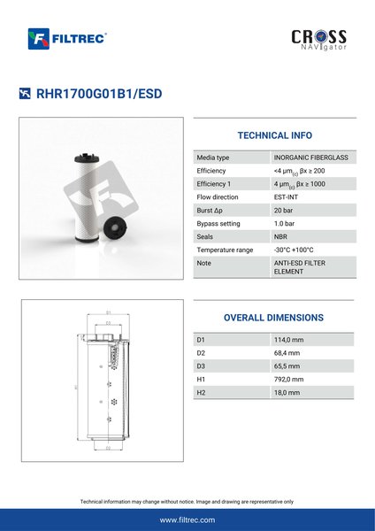 Engineered with their high performance media and a durable design, the RHR1700G01B1/ESD provides reliable and consistent performance over its lifespan, even in harsh operating environments. When you order from FilterFinder, you can trust that you are getting a reliable and high-quality replacement filter that will keep your system running smoothly.