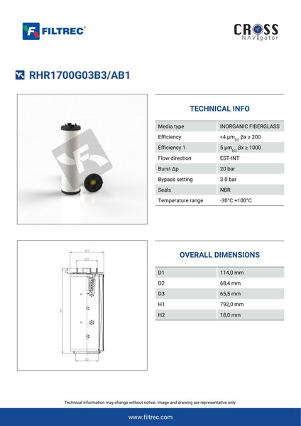 Genuine Filtrec RHR1700G03B3/AB1. This Filtrec element is designed to meet or exceed the quality and performance of brand OEM’s ensuring superior filtration performance and long-lasting durability.