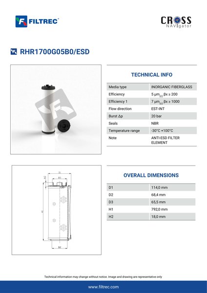 Genuine Filtrec RHR1700G05B0/ESD. This Filtrec element is designed to meet or exceed the quality and performance of brand OEM’s ensuring superior filtration performance and long-lasting durability.