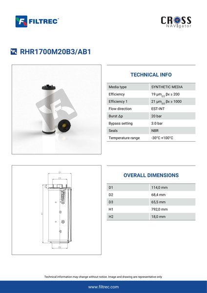 Genuine Filtrec RHR1700M20B3/AB1. This Filtrec element is designed to meet or exceed the quality and performance of brand OEM’s ensuring superior filtration performance and long-lasting durability.Engineered with their high performance media and a durable design, the RHR1700M20B3/AB1 provides reliable and consistent performance over its lifespan, even in harsh operating environments. When you order from FilterFinder, you can trust that you are getting a reliable and high-quality replacement filter that will keep your system running smoothly.