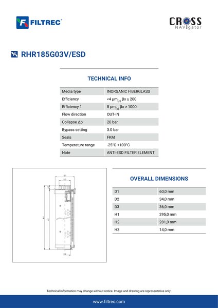 Genuine Filtrec RHR185G03V/ESD. This Filtrec element is designed to meet or exceed the quality and performance of brand OEM’s ensuring superior filtration performance and long-lasting durability.Engineered with their high performance media and a durable design, the RHR185G03V/ESD provides reliable and consistent performance over its lifespan, even in harsh operating environments. When you order from FilterFinder, you can trust that you are getting a reliable and high-quality replacement filter that will keep your system running smoothly.