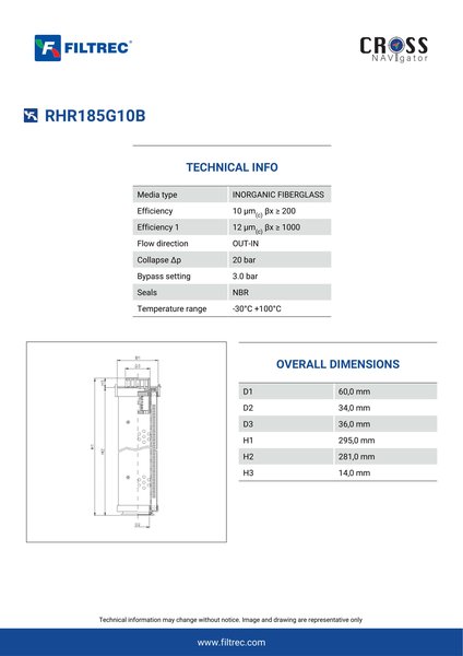 Genuine Filtrec RHR185G10B. This Filtrec element is designed to meet or exceed the quality and performance of brand OEM’s ensuring superior filtration performance and long-lasting durability.