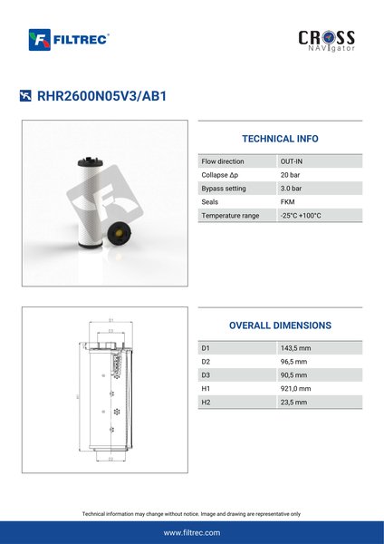 Genuine Filtrec RHR2600N05V3/AB1. This Filtrec element is designed to meet or exceed the quality and performance of brand OEM’s ensuring superior filtration performance and long-lasting durability.Engineered with their high performance media and a durable design, the RHR2600N05V3/AB1 provides reliable and consistent performance over its lifespan, even in harsh operating environments. When you order from FilterFinder, you can trust that you are getting a reliable and high-quality replacement filter that will keep your system running smoothly.